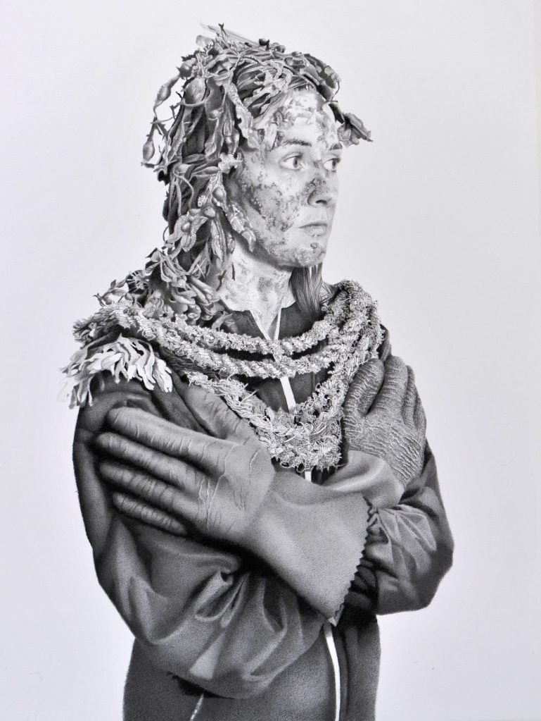 Leur apparence, proche de la photographie, simule leur existence présumée, bien qu’en regardant de très près, le dessin s’écarte légèrement du grain photo pour suggérer des paysages. Le crayon graphite permet d’affirmer les aspérités qui couvrent leur corps, comme s’ils étaient des êtres vivants en symbiose avec des micro-organismes. La surface de leur peau est un prolongement du paysage dans lequel ils évoluent. Leurs attitudes rappellent parfois celles des portraits de l’histoire de l’art qui m’ont marqué. Le testament de l’art serait-il ce qu’il me reste d’ancestralité active ?