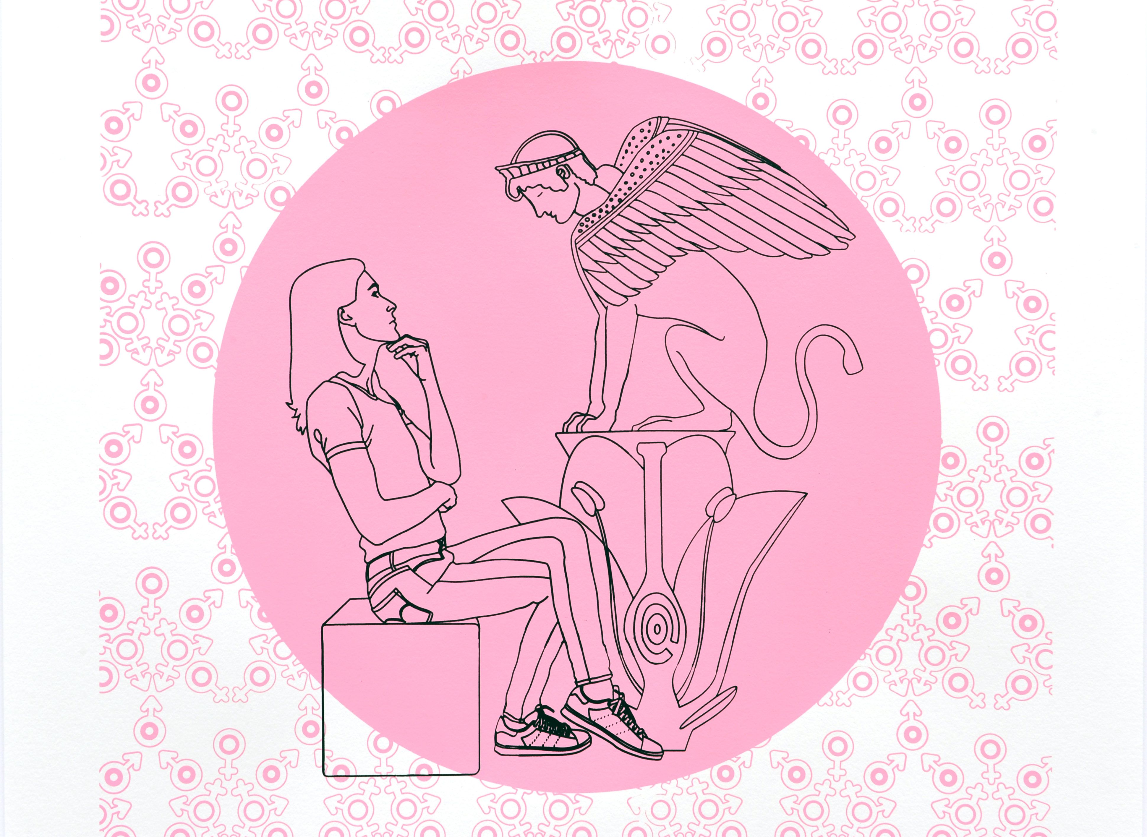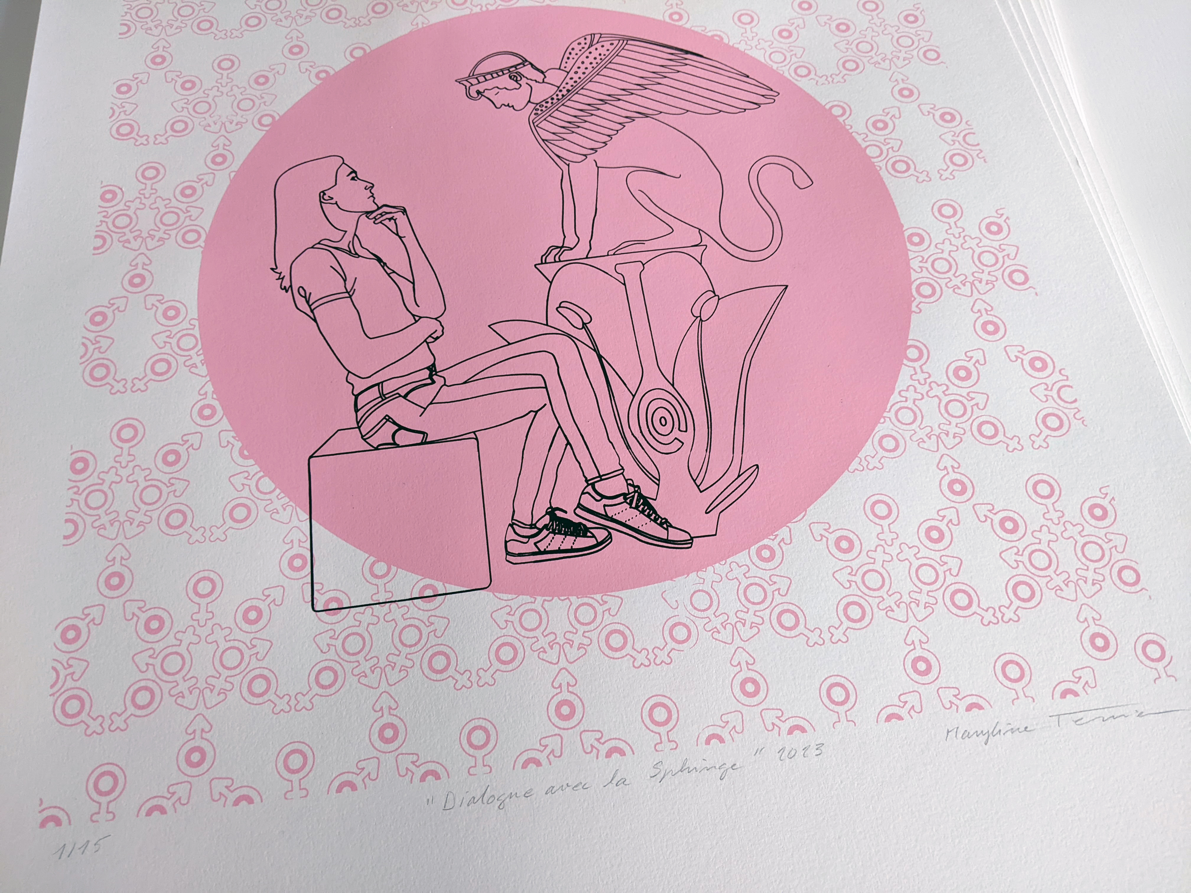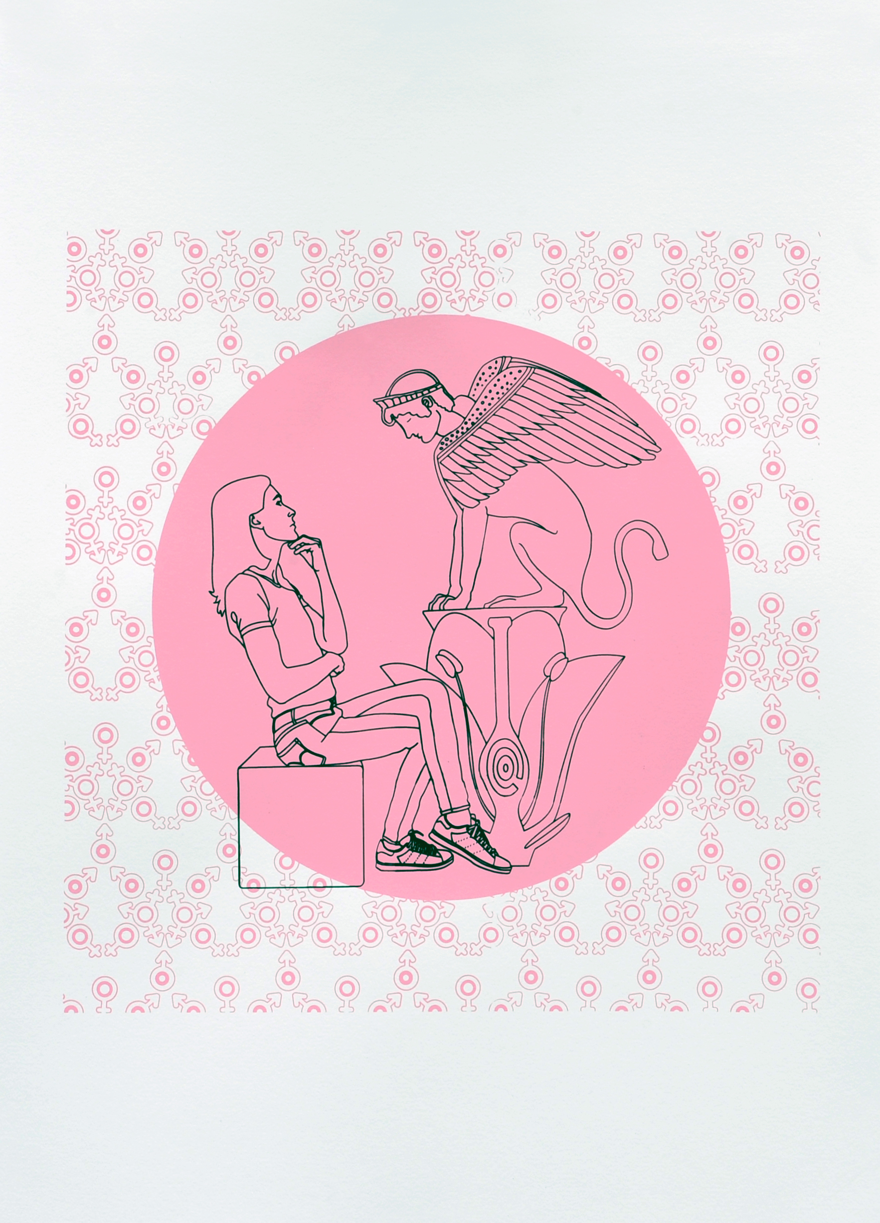 Dialogue avec la Sphinge ou Queer Œdipe, (d’après Œdipe et la Sphinge, kylix attique à figures rouges, Musées du Vatican), sérigraphie,2023, 70×50 cm, production Ecole d’Arts Plastiques de Denain, Courtesy H Gallery Paris.