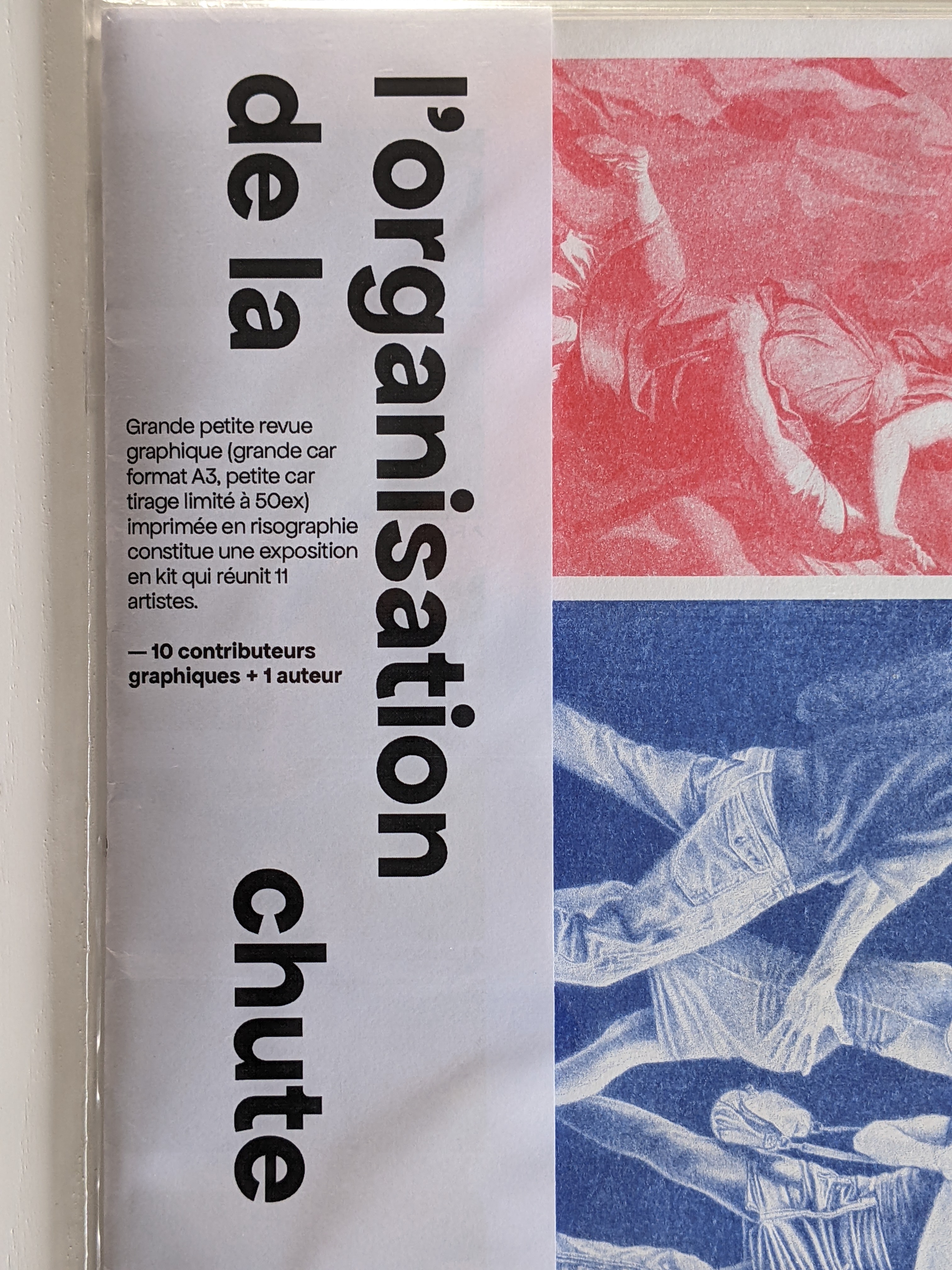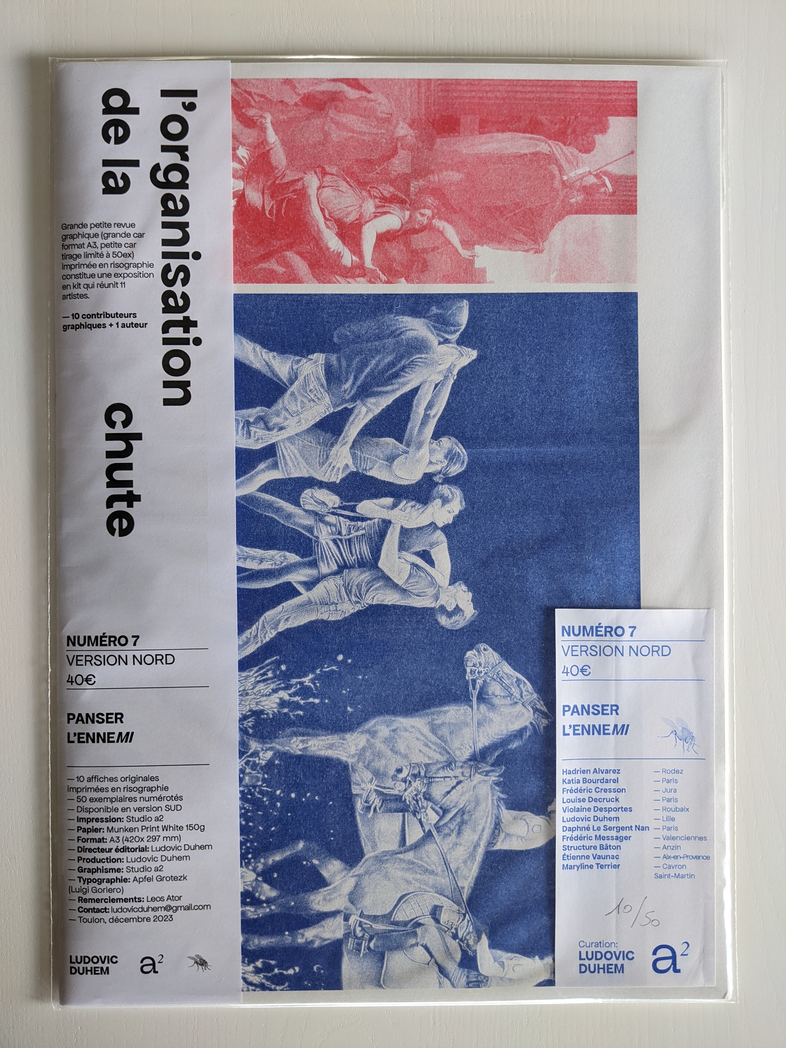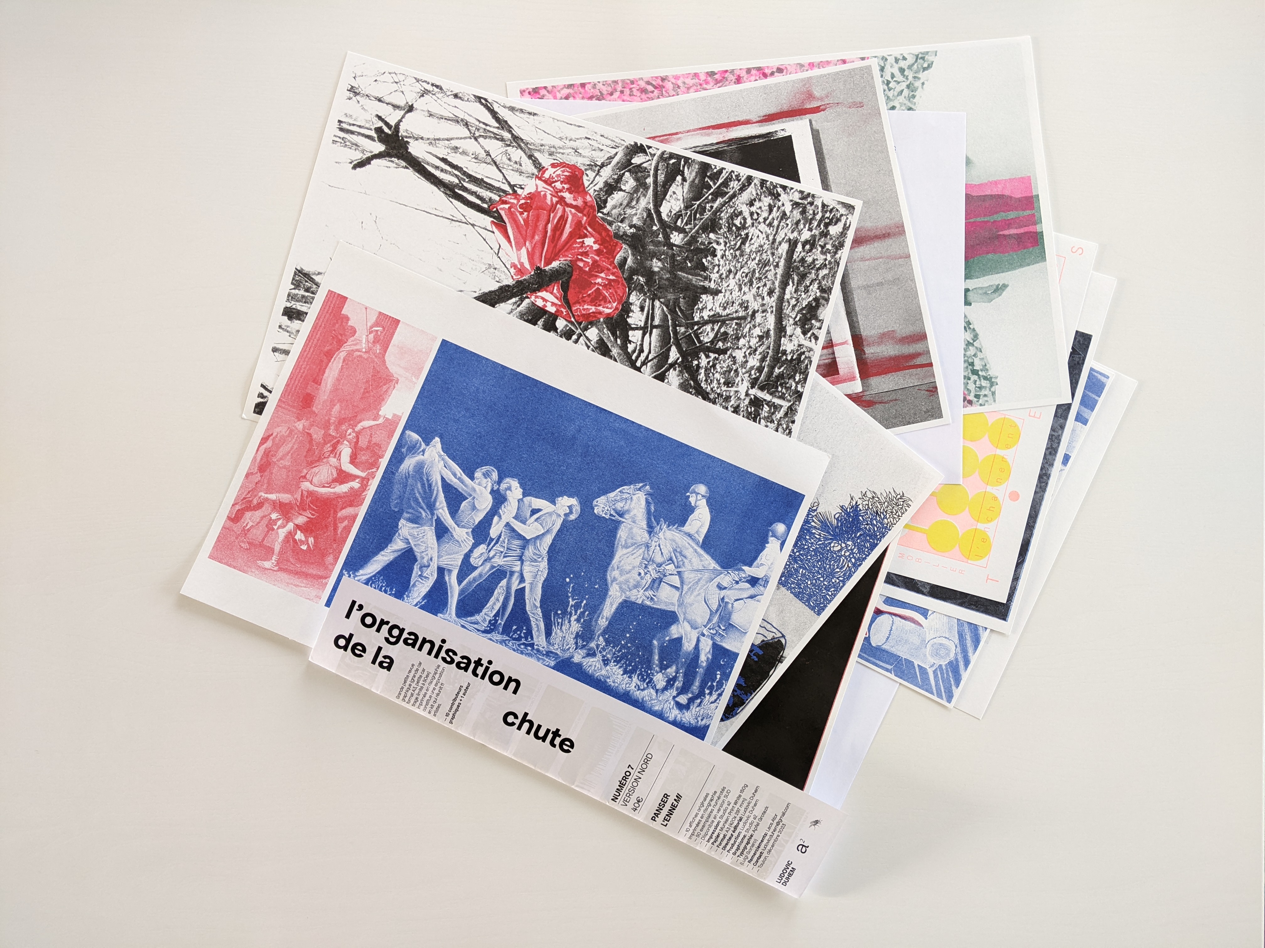 Edition L’organisation de la Chute. À l’initiative de Léos Ator, artiste multiforme, L’organisation de la Chute est une revue artistique composée de productions originales et indépendantes. Centrée sur des productions graphiques, accompagnées de textes littéraires et philosophiques, elle ne propose pas une critique d’art ni une analyse de l’art mais une relation sensible au monde contemporain. Deux comités sont constitués à ce jour : un comité Nord (dirigé à Lille par Ludovic Duhem) et un comité Sud (dirigé à Toulon par Les Ator), affirmant ainsi l’ancrage territorial de la revue. Co-produite avec la Villa Cool (Toulon), la revue est éditée à 50 exemplaires et imprimée en risographie par le Studio A2 en format A3.