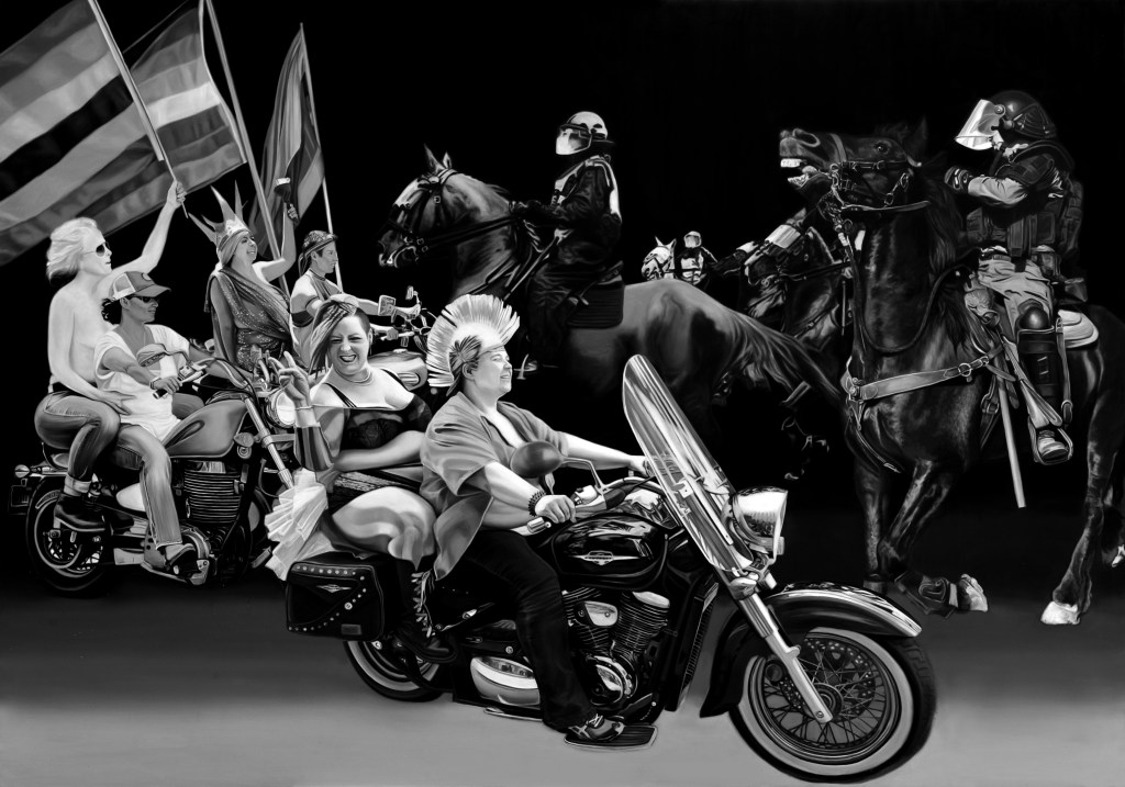 Chevauchée des Amazones – Dykes on Bikes , peinture à l’huile sur bois, 81×116 cm, 2021,