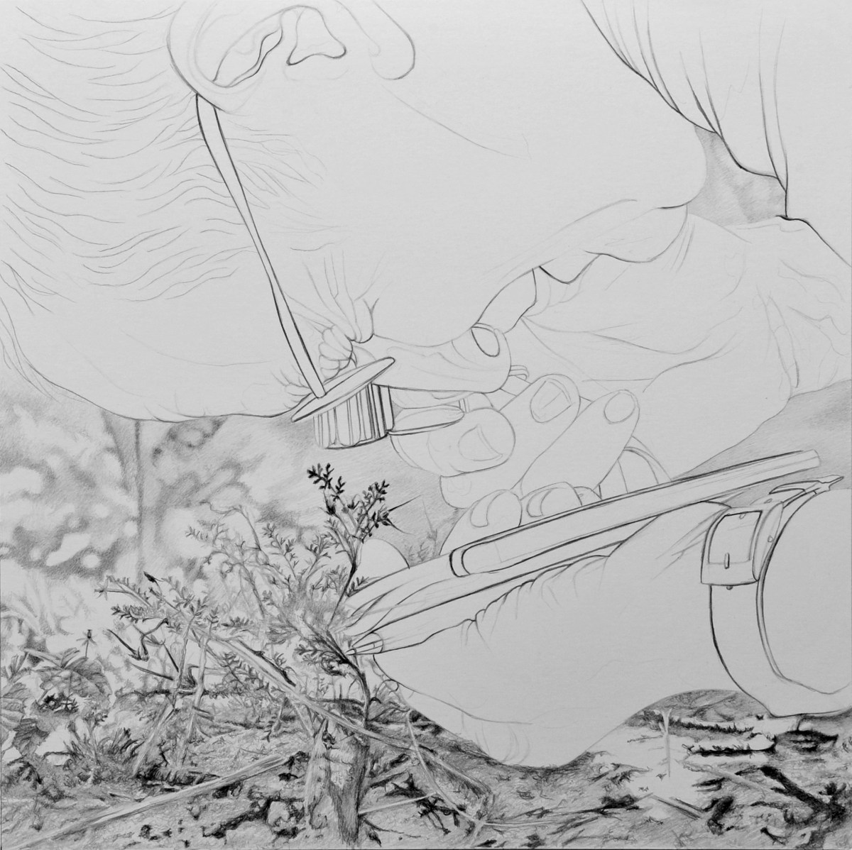 Plusieurs registres de perception sont apparus au cours de cette petite expédition. Tout d’abord les attitudes de ceux qui contorsionnent leur corps pour regarder des plantes sans les extraire de leur environnement. La question de la ressemblance à un modèle déjà connu émergeait rapidement comme méthode menant à la compréhension. L’usage des outils de vision, comme les loupes qui grossissent les textures, les smartphones qui cadrent les spécimens pour les renvoyer aux bibliothèques de reconnaissances de formes… cela nous faisait voyager de l’informe à la forme, des masses indifférenciées aux silhouettes graphiques. Les questions liées à la pratique du dessin étaient là ! S’ajoutait à cela la perception par le touché et par le goût, l’expérience qui consiste à ajouter de l’eau aux mousses sèches pour en révéler leur volume… Le guide, par moment, recourait au langage descriptif du livre pour accéder à la reconnaissance d’une espèce.